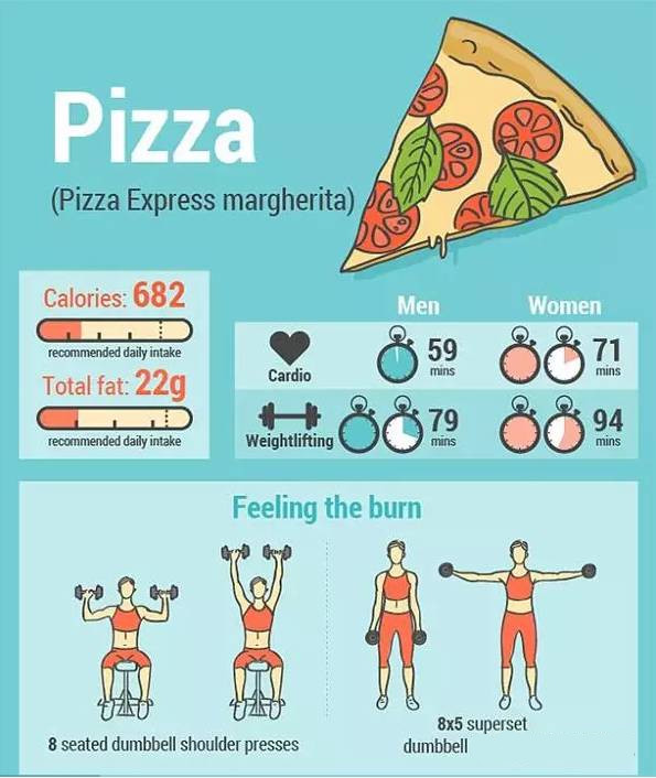 披萨有682卡路里热量和22克脂肪。一般女性要做一个半小时的举重才能燃烧掉一个披萨的热量。有氧运动要做1小时11分钟。相比较之下,一般男性要做将近一小时有氧运动和差不多1小时20分钟的举重。